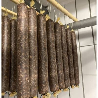 90% Rindfleisch, 10% Schweinespeck, Pöckelsalz, Gewürze, Säureregulator (E575 Glucono-Delta-lacton; Lactose), Maltodextin, Dextrose, Geschmacksverstärker: Mononatriumglutamat (E621), Antioxidationsmittel: Natriumascorbat (E301), Zwiebeln, Knoblauch, Speisewürze, Speisesalz, Palmfett gehärtet, Zucker,